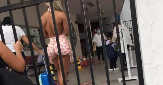 La mujer además es modelo profesional. Va a retirar al nene con ropa deportiva o