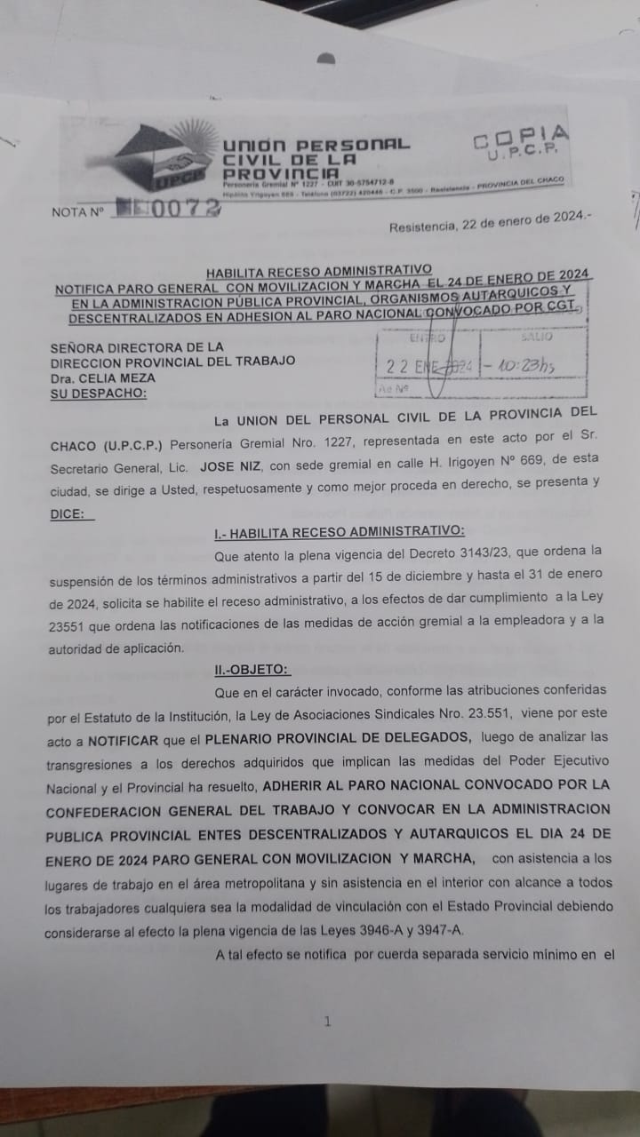 La UNION DEL PERSONAL CIVIL DE LA PROVINCIA DEL CHACO (U.P.C.P.) Personeria Gremial Nro. 1227,
