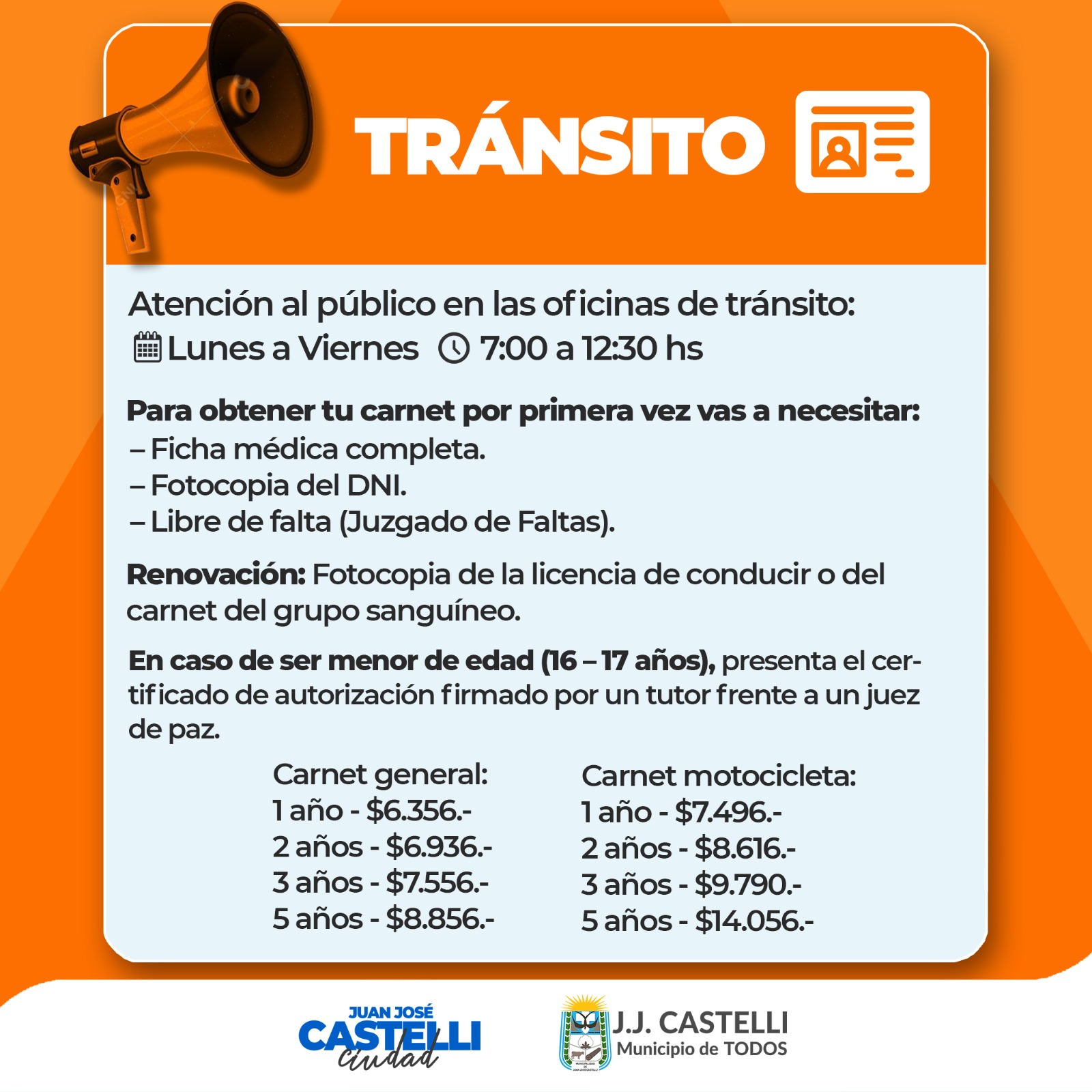 LA DIRECCIÓN DE TRÁNSITO DE LA MUNICIPALIDAD DE JUAN JOSÉ CASTELLI TE INFORMA: Aquí te