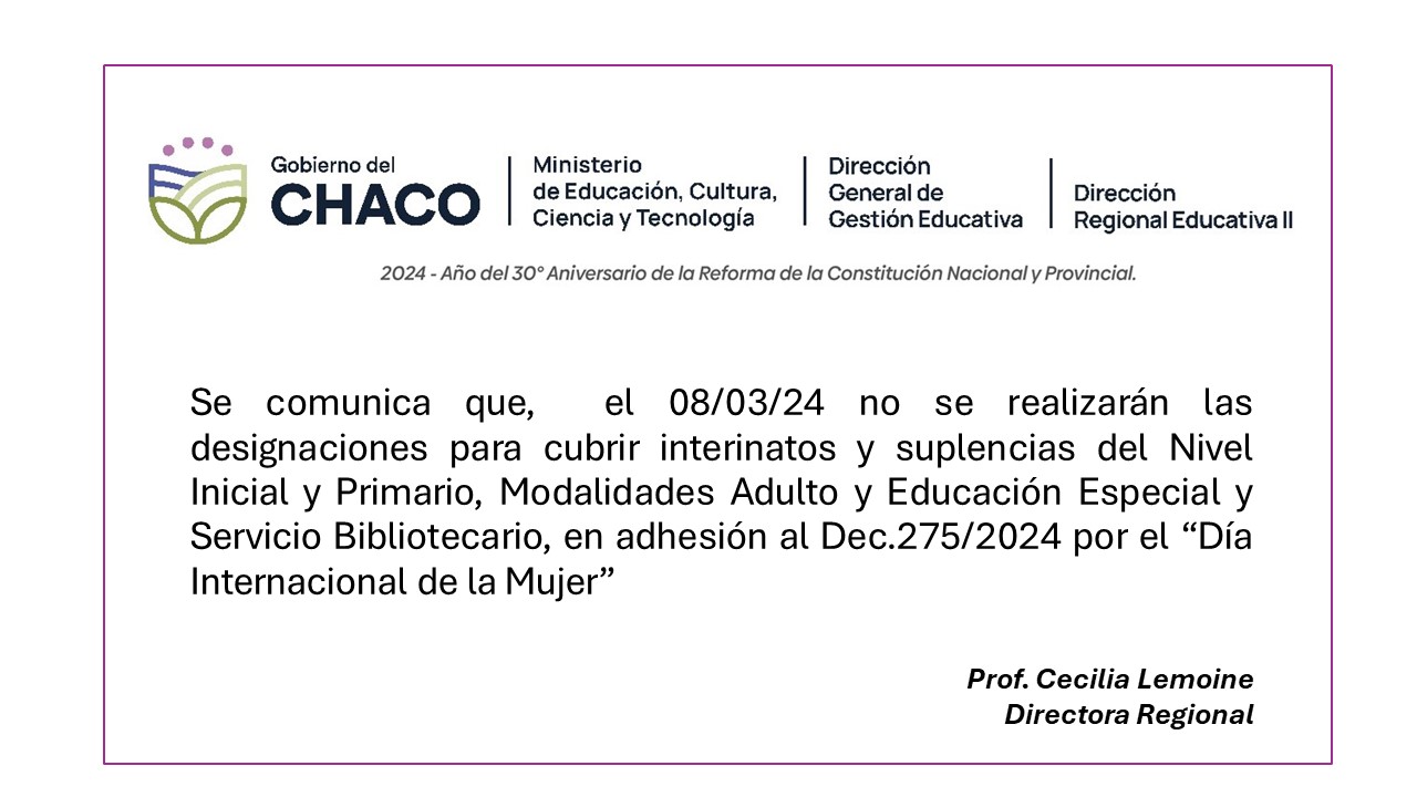 La directora Regional polinivel Prof. Cecilia Lemoine comunica que el 8 de marzo no se