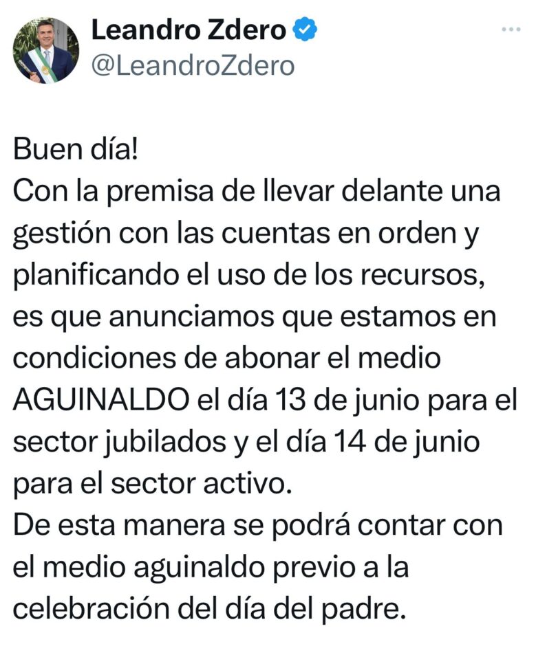 El gobernador Leandro Zdero anunció hoy el pago del medio aguinaldo para trabajadores de la