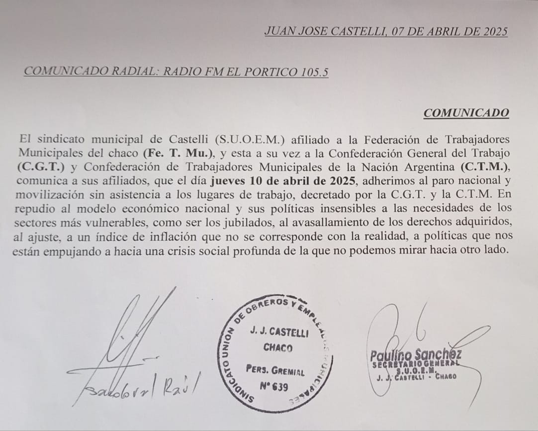PÓRTICO MULTIMEDIOS: envíanos información, audios, mensajes al 3644-688080/3644-404921 COMUNICADO: El sindicato municipal de Castelli (S.U.O.E.M)