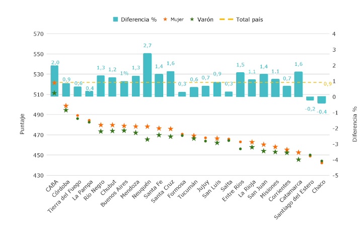 Las mujeres obtienen puntajes más altos en las pruebas estandarizadas de Lengua, tanto en primaria como en secundaria. Contrariamente, los varones obtienen puntajes más altos en las pruebas de Matemática. Estas brechas se agrandan al pasar de primaria a secundaria. Los varones llegan en tiempo y forma al último año de secundaria en mayor proporción que las mujeres. A su vez, las mujeres finalizan en mayor proporción tanto el secundario como la universidad.