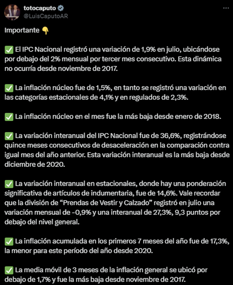 El Gobierno celebró el dato de inflación de julio: 1,9% mensual y una núcleo de 1,5%, con felicitaciones cruzadas entre Milei, Caputo y Sturzenegger en sus cuentas de X.