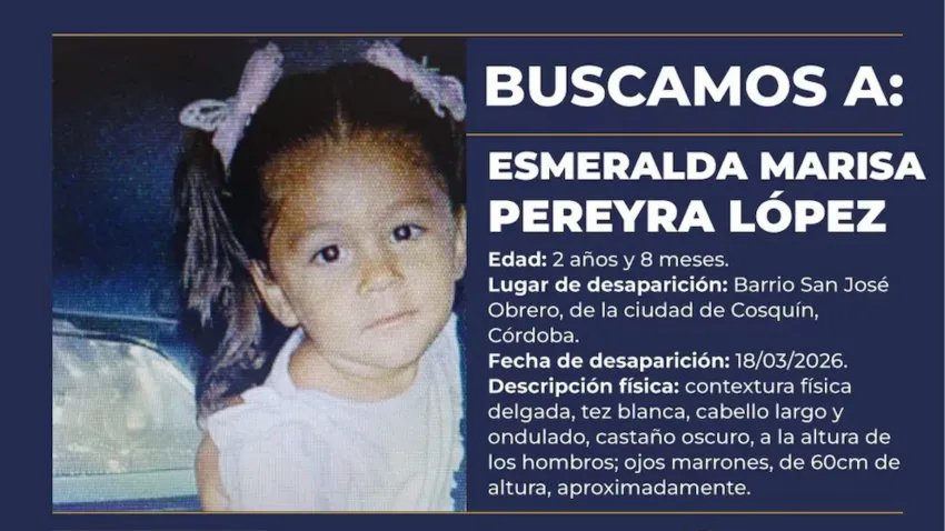 La desaparición de Esmeralda Pereyra López, de tan solo dos años, derivó en un operativo de alcance nacional que mantiene en alerta a las fuerzas de seguridad en todo el país. La niña fue vista por última vez el miércoles 18 de marzo por la tarde en la localidad cordobesa de Cosquín, y la investigación avanza bajo la hipótesis de un posible secuestro.