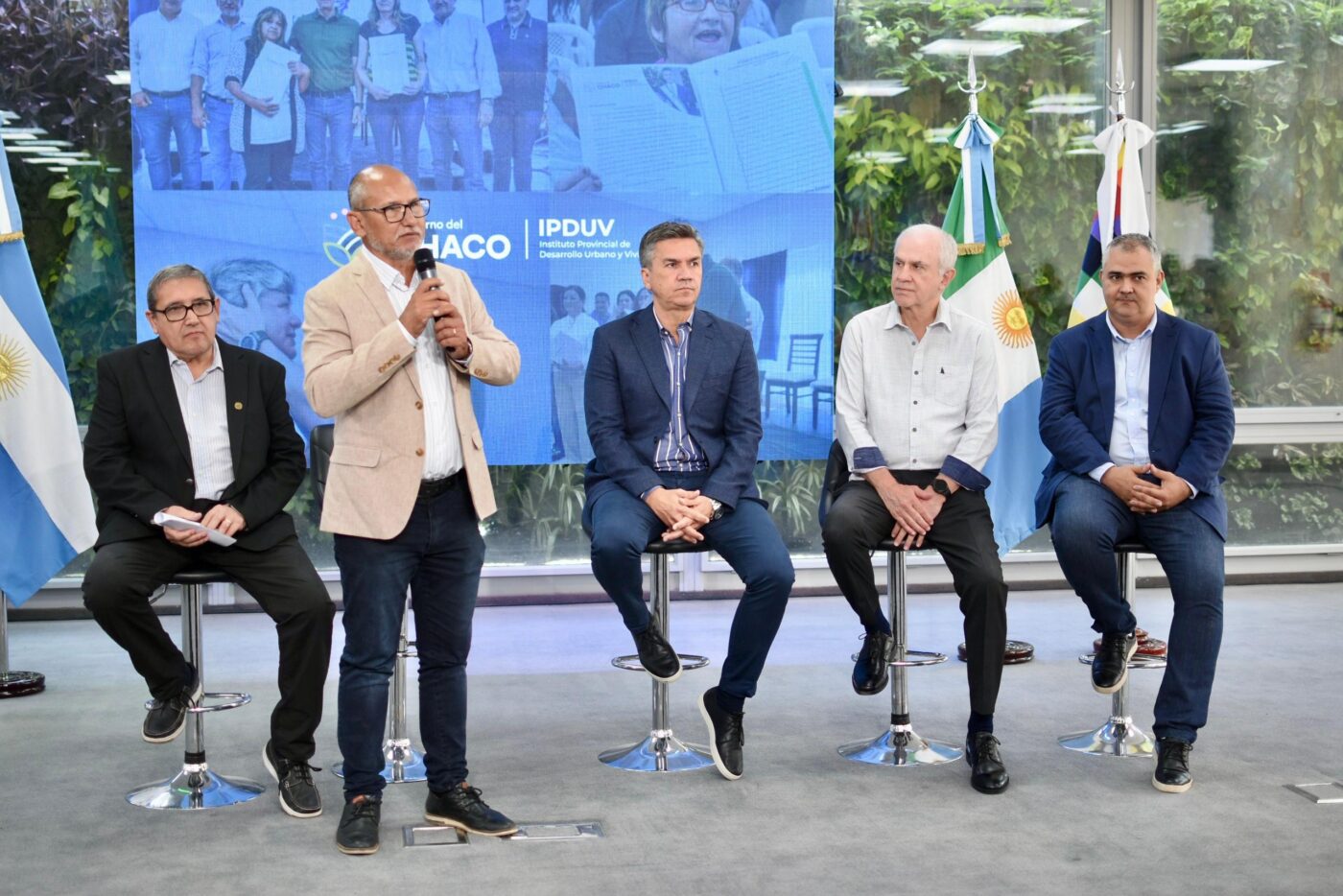 Acompañaron al gobernador Zdero en el acto, el presidente del IPDUV, Fernando Berecoechea; los vocales del organismo, Diego Gutiérrez y Daniel Monti; la subsecretaria de Asuntos Registrales, Mercedes Marinich y familias beneficiarias.