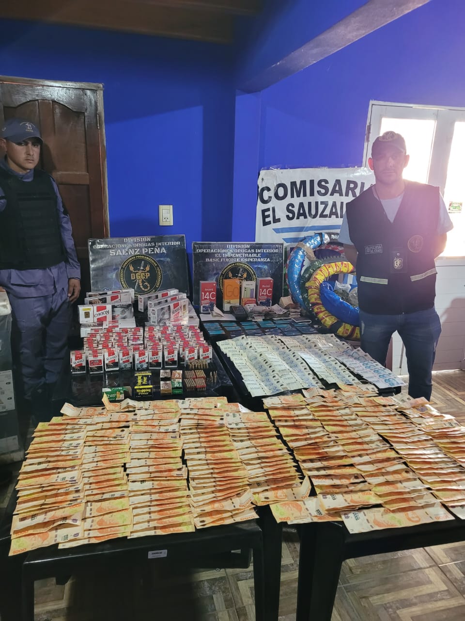 En la segunda vivienda, situada en la avenida Tero, en El Sauzalito, los efectivos hallaron 19 cartones de cigarrillos Rodeo y 64 paquetes sueltos, cuatro celulares, dos pendrives y varias tarjetas de débito y crédito a nombre de diferentes personas, un posnet, un kilogramo de hoja de coca, cuatro cubiertas de moto, una cocina y un lavarropas, también secuestraron cuatro cajas de cartuchos.