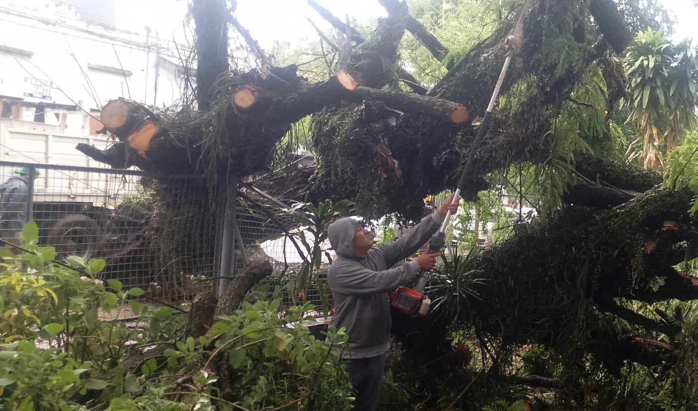 Una de las ubicaciones en las que se trabajó es Seitor 424, en donde cayó un ejemplar de grandes dimensiones que atravesó la calle impidiendo el tránsito vehicular. Además, en Ayacucho 200, frente a la Escuela N° 41, se desprendió una Tipa añosa. En este caso, las cuadrillas municipales redujeron los restos y les retiraron del lugar.
