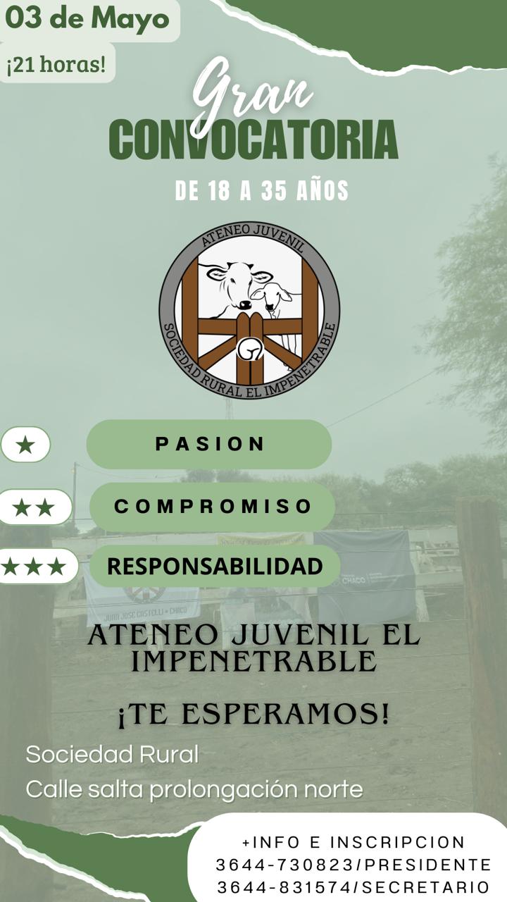 El ateneo Juvenil de la Sociedad Rural EL IMPENETRABLE realiza una Gran convocatoria para jóvenes entre 18 y 35 años de edad, para el viernes 03 de mayo a partir de las 21 horas en la Sociedad Rural el impenetrable cito en calle Salta Prolongación norte de nuestra ciudad.