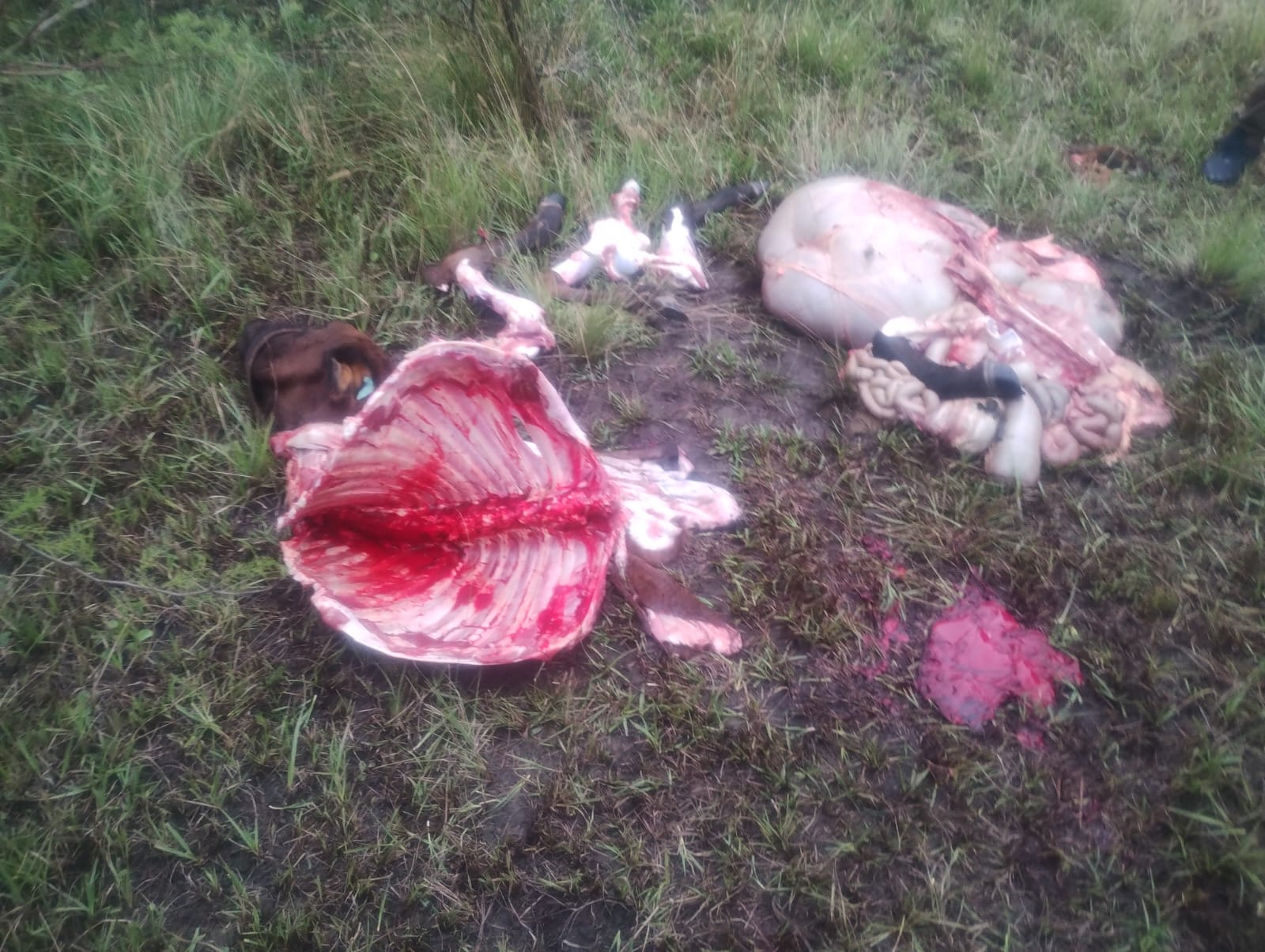 Posteriormente, los efectivos continuaron con las tareas investigativas en el interior del campo, donde recorrieron aproximadamente dos kilómetros, donde se hallaron restos de un animal vacuno sobre un alambrado.