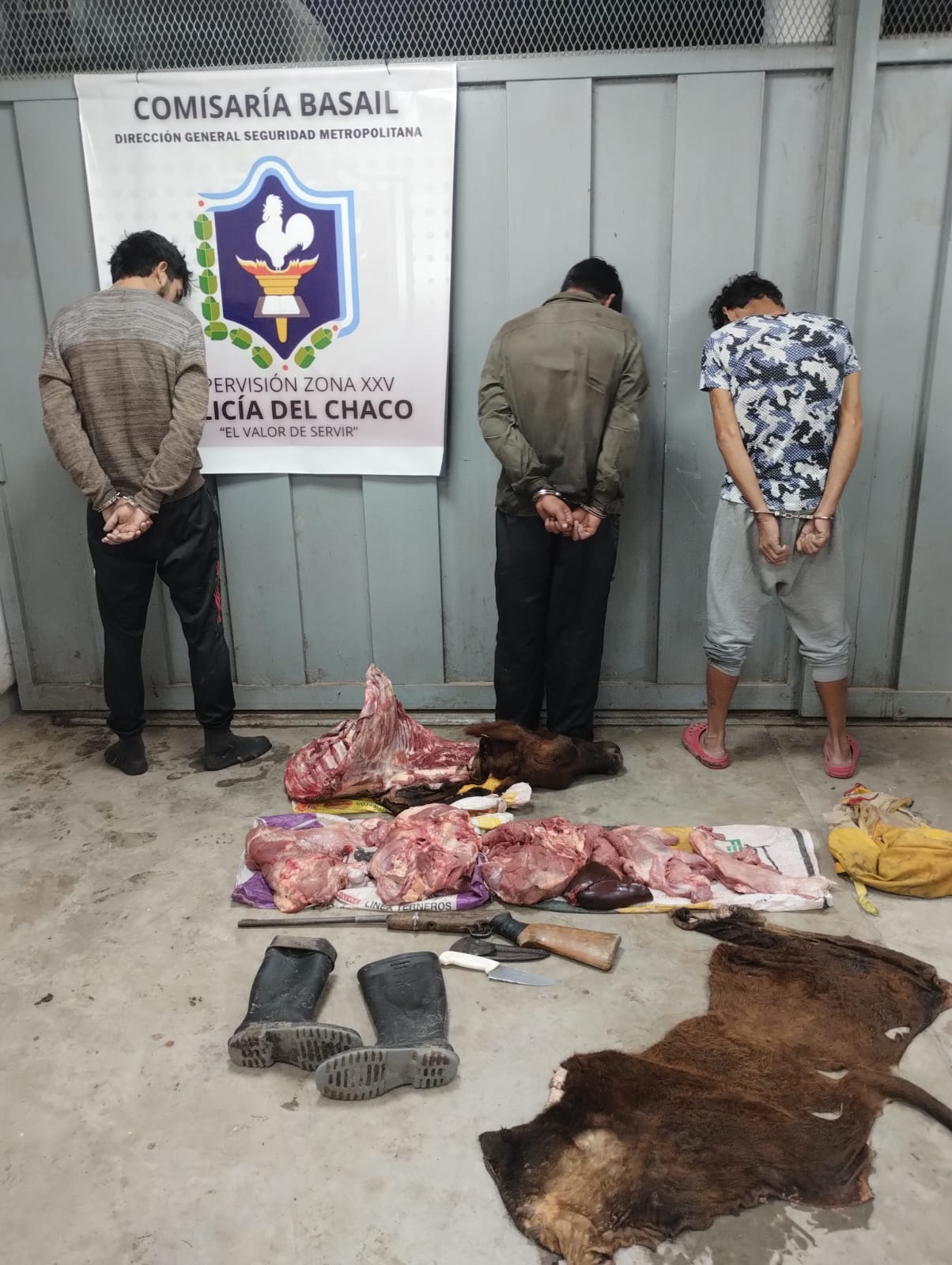 Durante la requisa, se constató que las bolsas contenían aproximadamente 40 kilos de carne vacuna. Además, se secuestró un rifle tipo carabina calibre .22 sin marca visible ni número de serie, con un cartucho del mismo calibre, y un cuchillo de unos 30 centímetros y su correspondiente vaina. Los demorados no pudieron acreditar la procedencia del producto cárnico.