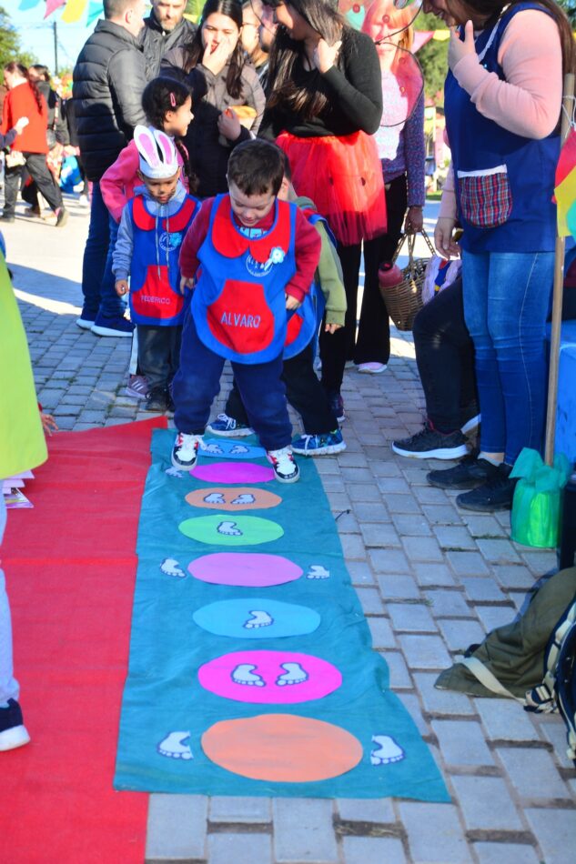 Cada institución preparó su propio stand con propuestas lúdicas, transformando la plaza en un verdadero parque temático lleno de color, risas y creatividad.