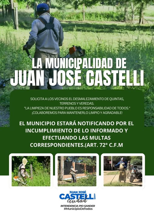 La Municipalidad de Juan José Castelli solicita a los vecinos realizar el desmalezamiento de quintas, terrenos y veredas