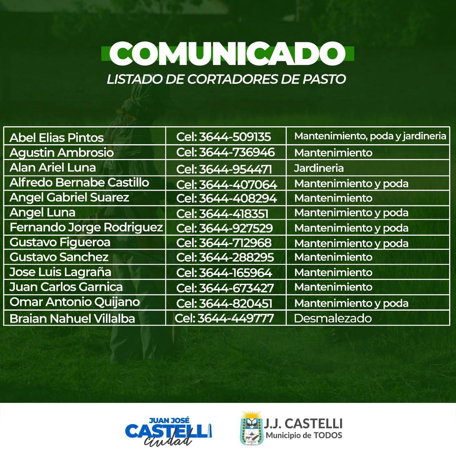 El Municipio pone a disposición de los vecinos una lista de cortadores de pasto inscriptos y habilitados, que brindan servicios particulares de jardinería y corte de malezas, facilitando el cumplimiento de esta tarea.