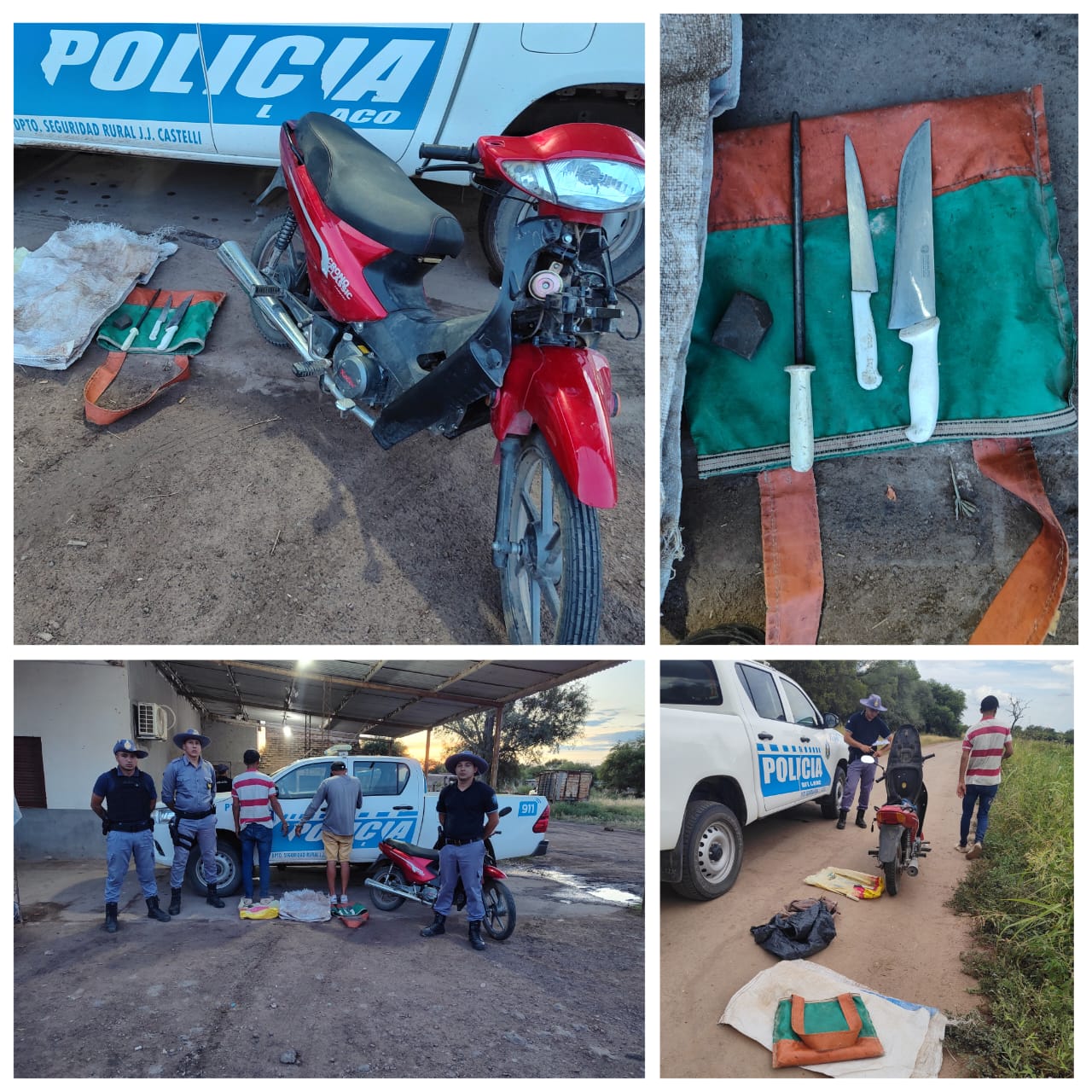 Personal Departamento Rural Castelli, marco estar realizando Operativo de prevención zona rural Paraje La Argentina, observan dos masculinos saliendo de un inmueble rural actitud sospechosa al notar presencia policial intentan darse a la fuga a bordo de una motocicleta, tipo 110cc., siendo alcanzado escaso metros, identificándose ambos masculino L. C., (35) y M. V. (24) quienes tenían en su poder (02) cuchillos, (01) chaira, (01) piedra de afilar (04) bolsa de nylon, (01) bolso de lona. Ambos sujetos fueron conducidos hasta la dependencia policial como así también procedió secuestro de los elementos mencionados.