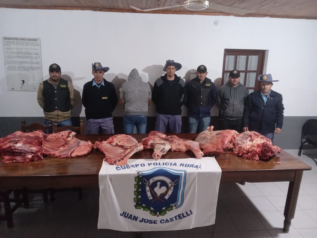 Una comisión del Departamento Seguridad Rural J.J. Castelli, se dirigió al lugar, donde interiorizados de la situación, entrevistaron a un hombre de 29 años, conductor de un automóvil Renault Logan, constatando en el habitáculo del baúl dos cuartos, dos costillares, dos paletas, un espinazo y un cogote de animal vacuno, arrojando un pesaje total de 130 Kgs.