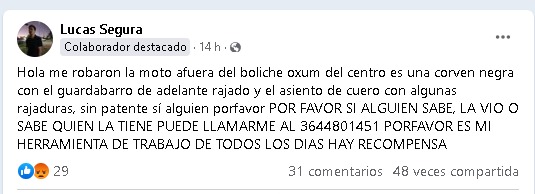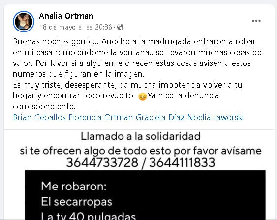 También posteo “Me entraron a robar en mi departamento y se llevaron pava eléctrica nueva, estufa nueva, colchón, televisor Hitachi, sillas de plástico blanca más el tubo de gas y ropas personales. Del aipo2 cualquier información se los agradecería necesito recuperar las cosas. 3644297179”