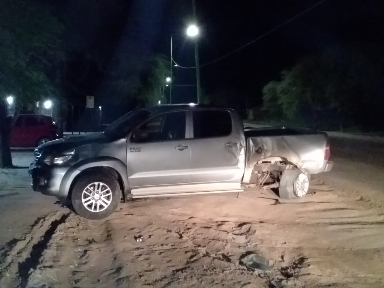 Al arribo se constató el vuelco de una camioneta Toyota Hilux color gris, sobre su lateral izquierdo recostado sobre la jirafa del alumbrado público con su frente hacia el cardinal suroeste, cuyo conductor J.A.K. de 32 años, fue traslado en ambulancia hacia el hospital local posteriormente se informa del hospital Conductor permanece en observación sector sala de emergencia del hospital local a espera estudios complementarios por alto estado de intoxicación alcohólica”.