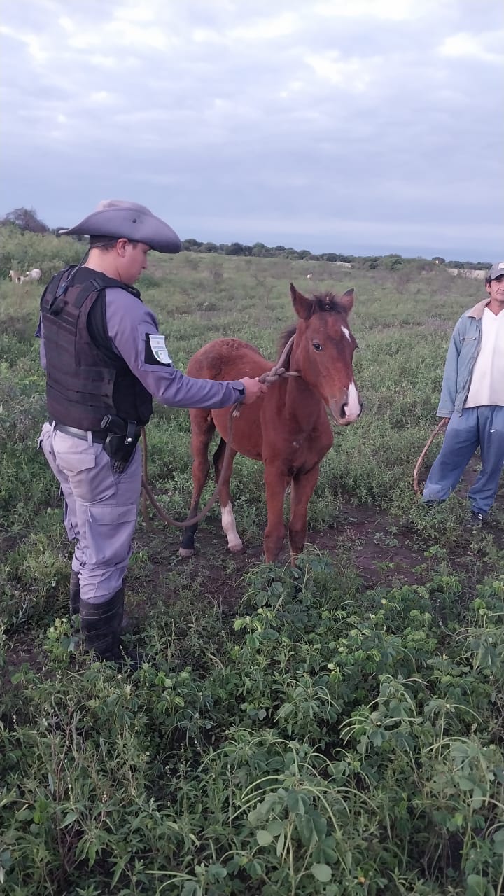 SINTESIS: Fecha, hora indicada solicito presencia policial ante lugar de referencia Sr. AGUILAR A. A. Debido a la sustracción de (02) animales equinos de su propiedad. Constituida prevención previa entrevista con denunciante constata faena de un animal equino de reciente data sobre interior de monte; el cual se encontraba con partes trozadas y colocadas sobre interior de bolsas. Se realizó formal secuestro de producto cárnico. Continuando con operativo cerrojo sobre lugar se halló tambeado sobre interior de zona boscosa (1) animal equino de afirmaciones espontanea del Sr. AGUILAR, tanto el animal faenado como el segundo hallado tambeado serian de su propiedad. Trasladando prevención de forma urgente hacia zona segura.