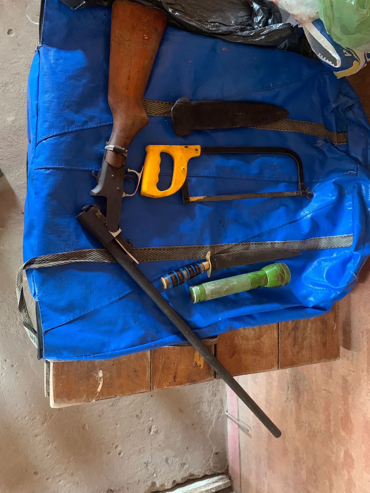 Se procedió aprehensión de sereno del lugar ciudadano D.S.M., de 23 años, Ddo. Lote N° 3 de Villa Berthet, realizando secuestro de (01) escopeta marca INVICTA, calibre 16, culata de madera, Con mancha símil sangre, conteniendo en recámara una vaina servida de cartucho mismo calibre, marca ORBEA. (01) linterna, color verde, (01) arma blanca, Marca CIRIRI (01) sierra de mano, Marca TRAMONTINA, (01) bolso material Lona, color azul.