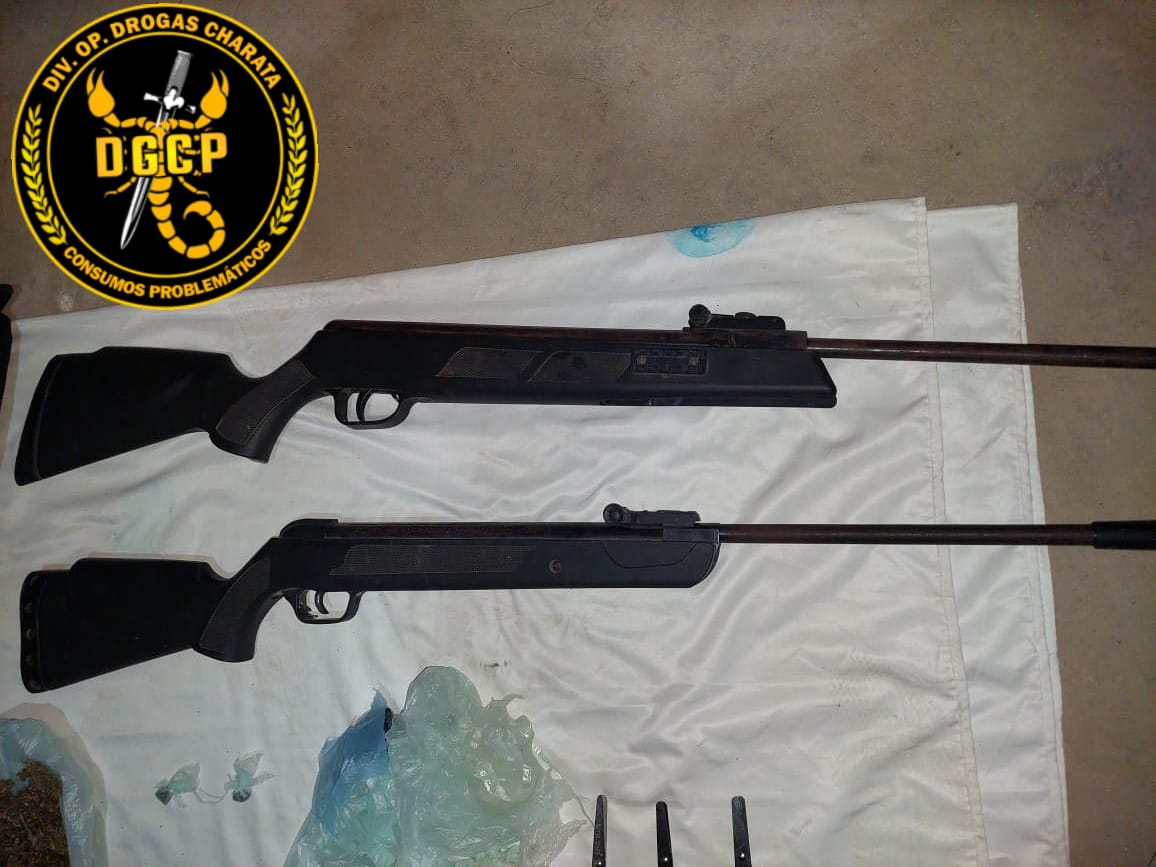 También incautaron dos rifles aire comprimido y una planta de cannabis sativa.