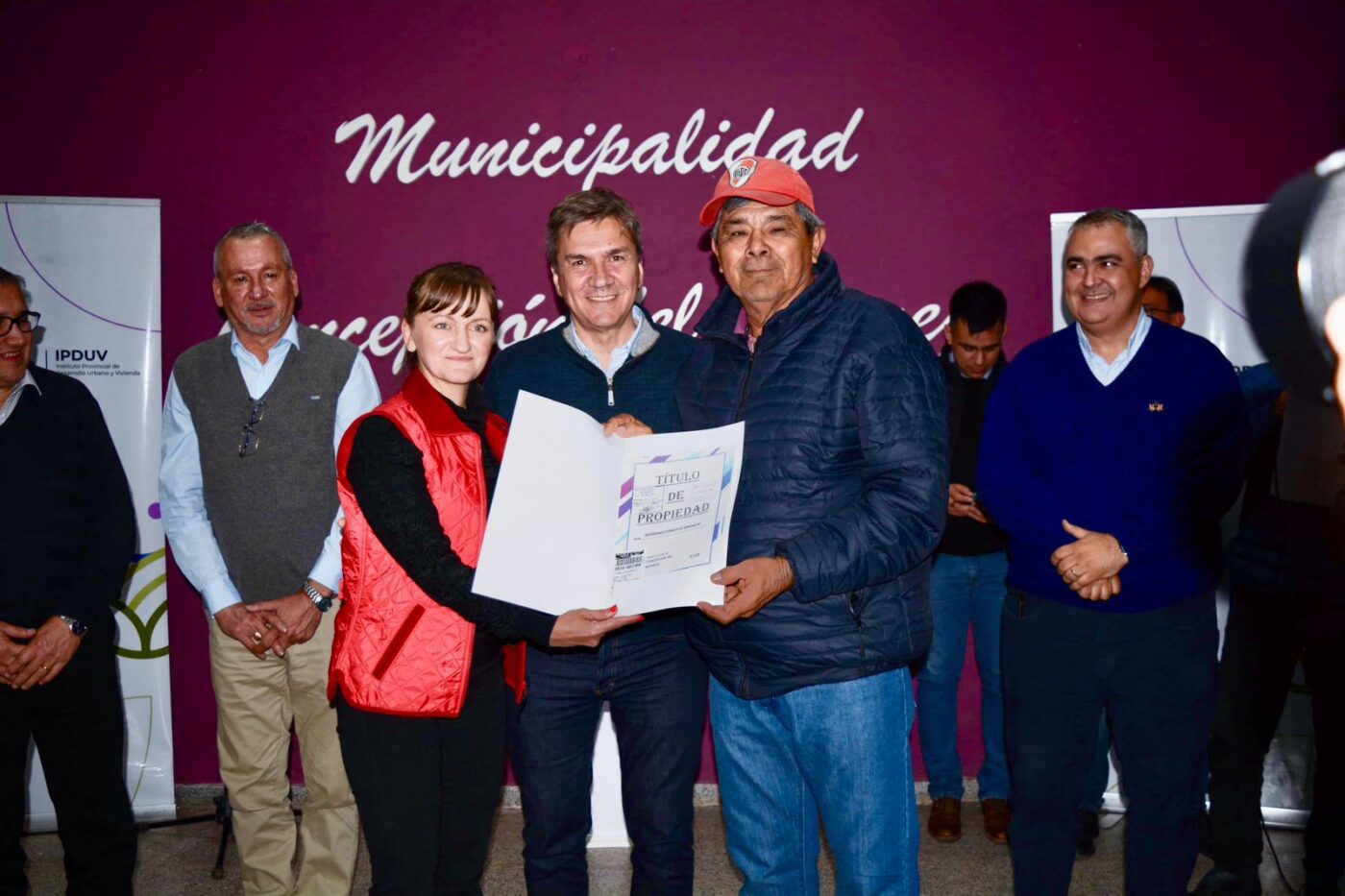 El primer mandatario provincial entregó títulos a familias que esperaron hasta 44 años para obtenerlos. Además, comunicó el inicio de una primera etapa de siete cuadras de pavimento y el inicio de ocho, de un paquete de 20 viviendas.