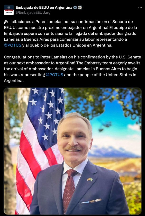 «¡Felicitaciones a Peter Lamelas por su confirmación en el Senado de EE.UU. como nuestro próximo embajador en Argentina! El equipo de la Embajada espera con entusiasmo la llegada del embajador designado Lamelas a Buenos Aires para comenzar su labor representando a Donadl Trump (@POTUS) y al pueblo de los Estados Unidos en Argentina», anunciaron desde la cuenta oficial de la embajada de los Estados Unidos.