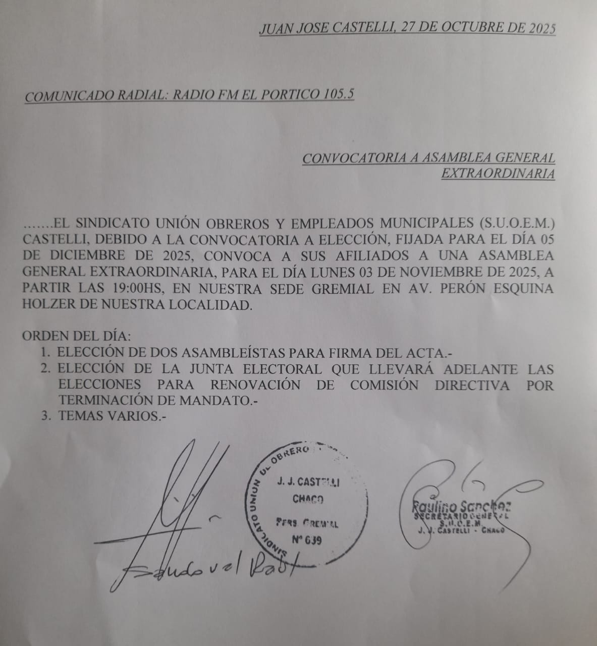 EL SINDICATO UNIÓN OBREROS Y EMPLEADOS MUNICIPALES (S.U.O.E.M.) CASTELLI, DEBIDO A LA CONVOCATORIA A ELECCIÓN, FIJADA PARA EL DÍA 05 DE DICIEMBRE DE 2025, CONVOCA A SUS AFILIADOS A UNA ASAMBLEA GENERAL EXTRAORDINARIA, PARA EL DÍA LUNES 03 DE NOVIEMBRE DE 2025, A PARTIR LAS 19:00HS, EN NUESTRA SEDE GREMIAL EN AV. PERÓN ESQUINA HOLZER DE NUESTRA LOCALIDAD.