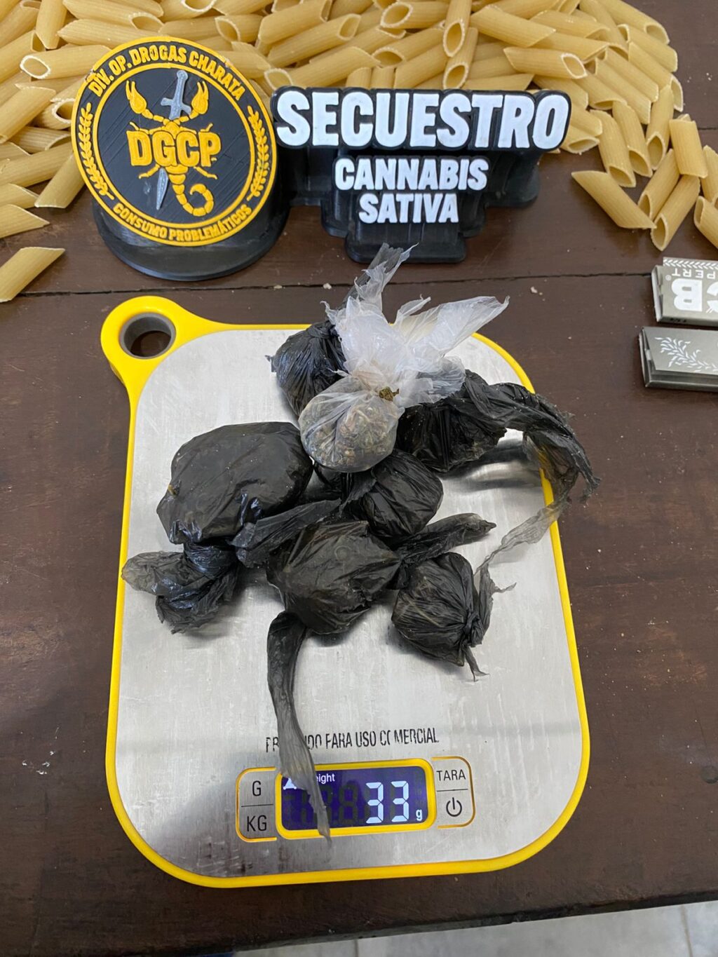 La División Operaciones Drogas de Charata realizó las pruebas de campo, que dieron como resultado positivo 33 gramos de marihuana distribuidos en siete bochitas y 6,2 gramos de cocaína en otra envoltura.