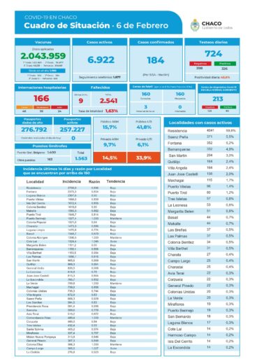 El gobierno provincial dio a conocer esta noche un nuevo cuadro de situación epidemiológica en el marco de la pandemia por COVID-19. En el informe elaborado este domingo 6 de febrero, los testeos diarios realizados sumaron 724 (398 negativos y 326 positivos) con un porcentaje de positividad diaria del 45 por ciento.