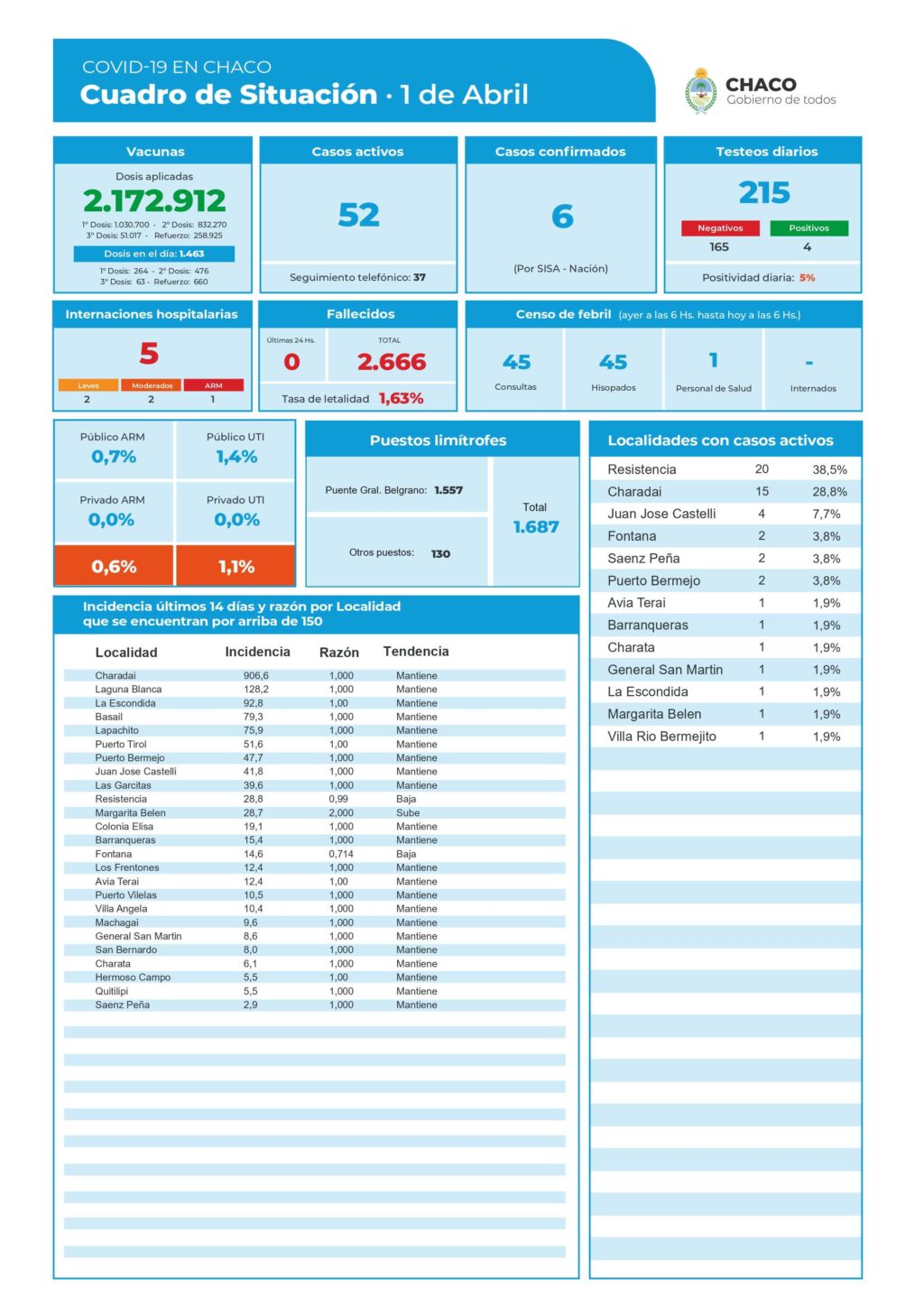 El gobierno provincial dio a conocer en la noche de este viernes 1 de abril, un nuevo cuadro de situación epidemiológica en el marco de la pandemia por COVID-19. En el informe, los testeos diarios realizados fueron 215 (165 negativos y 4 positivos) con un porcentaje de positividad diaria del 5 por ciento.