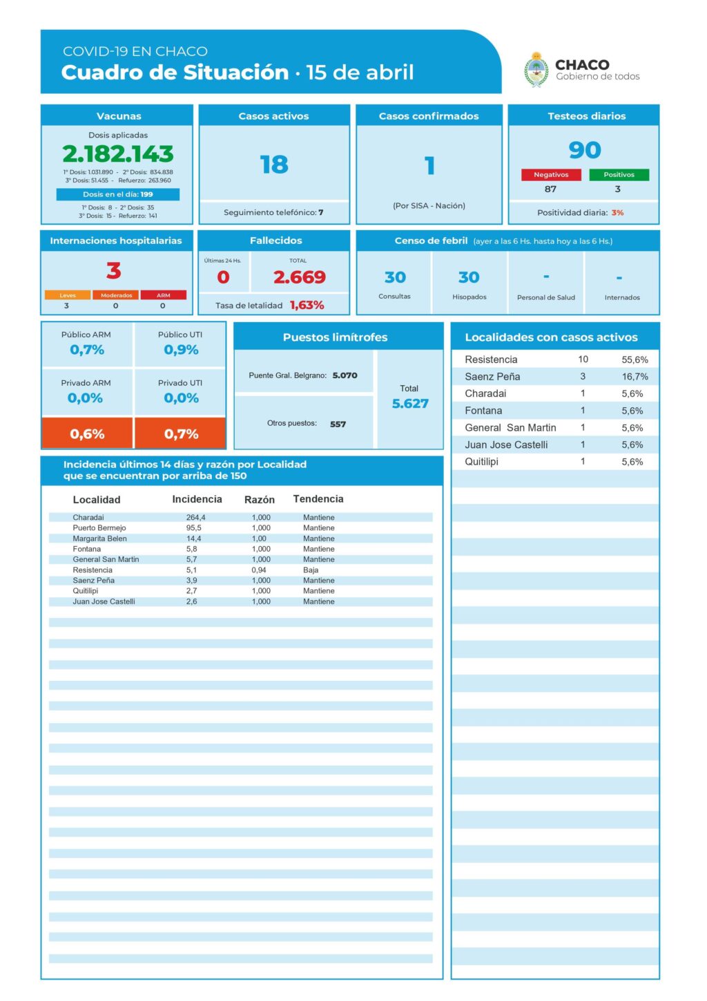 COVID-19: CUADRO DE SITUACIÓN DIARIO EN LA PROVINCIA DEL CHACO