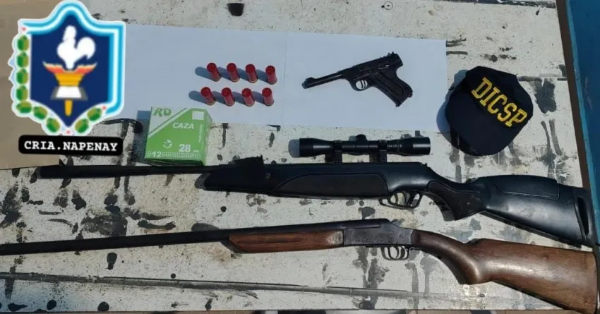Durante la requisa, los efectivos hallaron y secuestraron un teléfono celular, un rifle calibre 22 con mira telescópica, una escopeta calibre 12, ocho cartuchos y una pistola calibre 22 sin número visible. Las armas quedaron en poder del ayudante fiscal para su análisis.