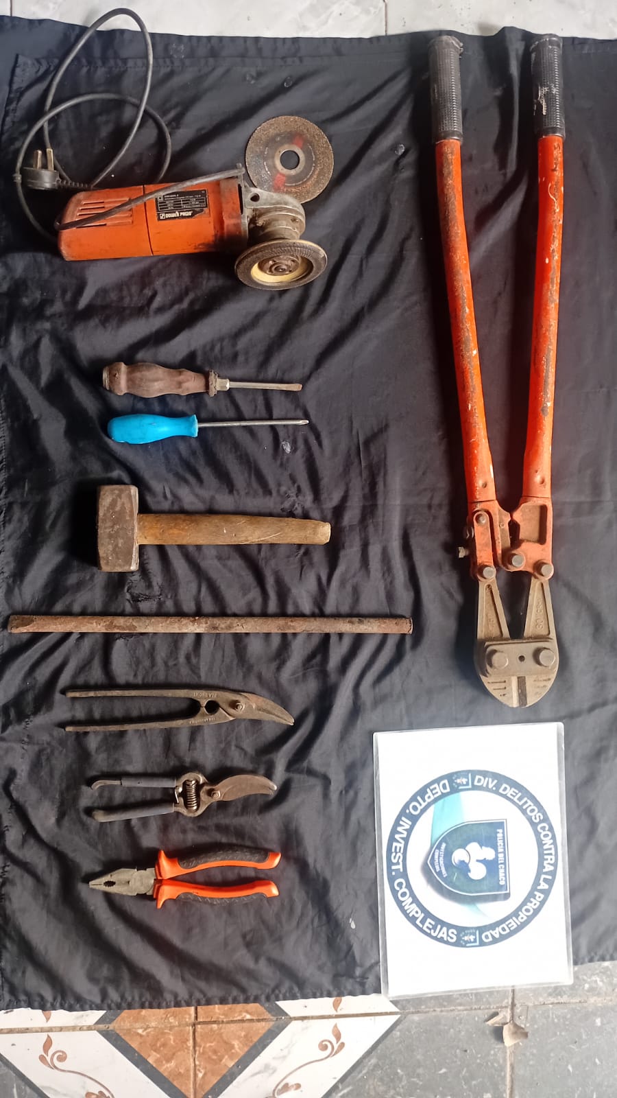 En uno de los domicilios allanados, ubicado en Villa Guío, se procedió al secuestro de diversas herramientas, entre ellas una amoladora, maza, disco de corte, corta hierro, pinzas, destornilladores y corta candado, todos elementos de interés para la causa.