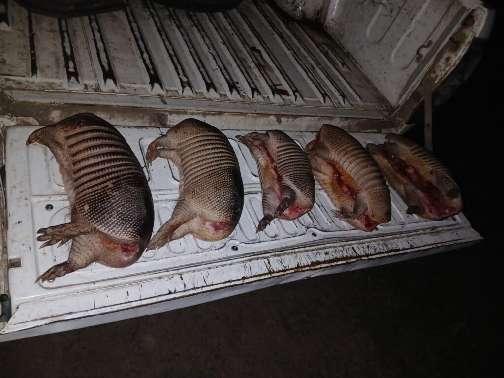 Al realizar la inspección de rutina sobre el rodado, los agentes hallaron una bolsa de polietileno que contenía en su interior cinco ejemplares de la especie Tatú Mulita (Dasypus hybridus) ya faenados. Al solicitarle los permisos de caza correspondientes y la habilitación expedida por los organismos pertinentes, el conductor manifestó no poseer ningún tipo de documentación.