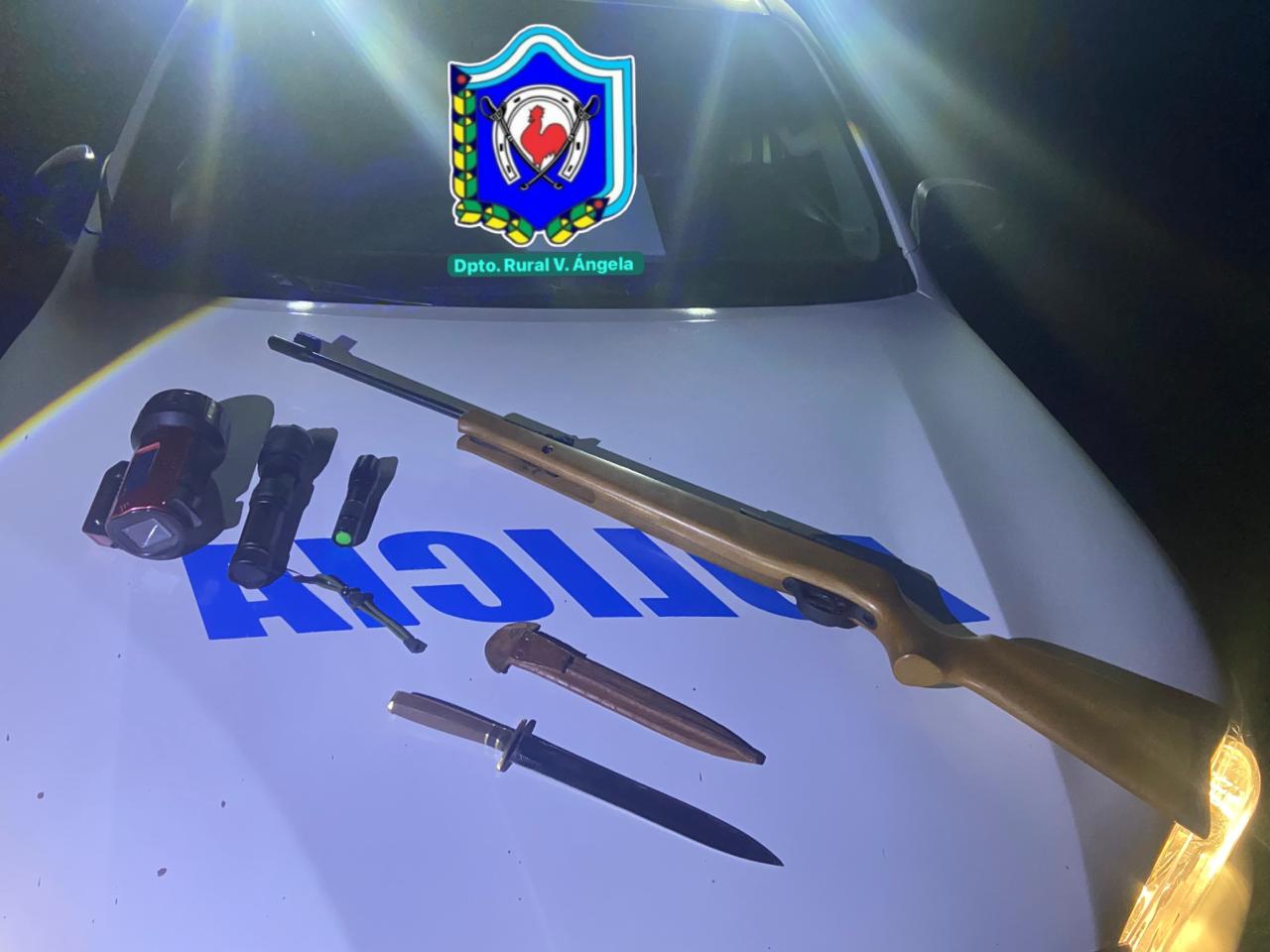 A las 03:45, en Colonia La Avanzada jurisdicción de Coronel Du Graty, efectivos detuvieron la marcha de una camioneta Toyota gris en la que circulaban dos sujetos de 27 y 20 años. Tras ser identificados, hallaron en el vehículo, un rifle de aire comprimido calibre 5.5 mm marca Fox con 12 balines, tres linternas recargables, un cuchillo tipo puñal con vaina de cuero.