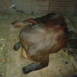 Seguidamente se verifica la carrocería del camión, notando allí dentro *(01) animal vacuno, sexo hembra, categoría vaca, pelaje osca, raza criolla, de unos 450 kg. Aproximadamente, con marca estampada similar a rombo con rayo al medio y señal en ambos pabellones auriculares similar a muesca abajo en ambas, maneada en sus cuatro extremidades, sin certificado guía que abale su transporte, notando la prevención que la marca y señal corresponden al señor E.P. en virtud a que días anteriores realizaron allanamiento en búsqueda de otros animales sustraídos.