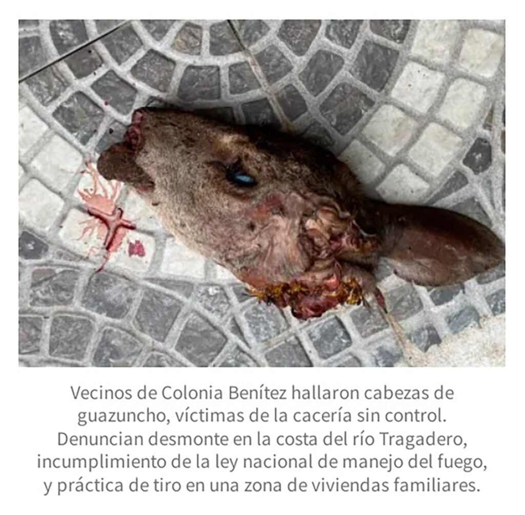 Vecinos de Colonia Benítez hallaron cabezas de guazuncho, víctimas de la cacería sin control. Denuncian desmontes en la costa del río Tragadero, incumplimiento de la ley nacional de manejo del fuego, y práctica de tiro en una zona de viviendas familiares.