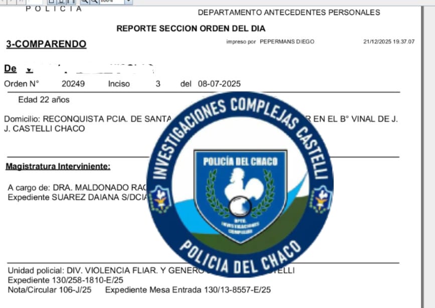 Al verificar sus datos personales en el sistema SiGeBi, se confirmó que sobre el joven pesaba un pedido activo de comparendo, conforme a la Nota Circular N.º 106-J/2025, en el marco de la causa “S.D. s/ denuncia c/ V.N.”, correspondiente al Expediente Policial N.º 130/258-1810-E/2025.