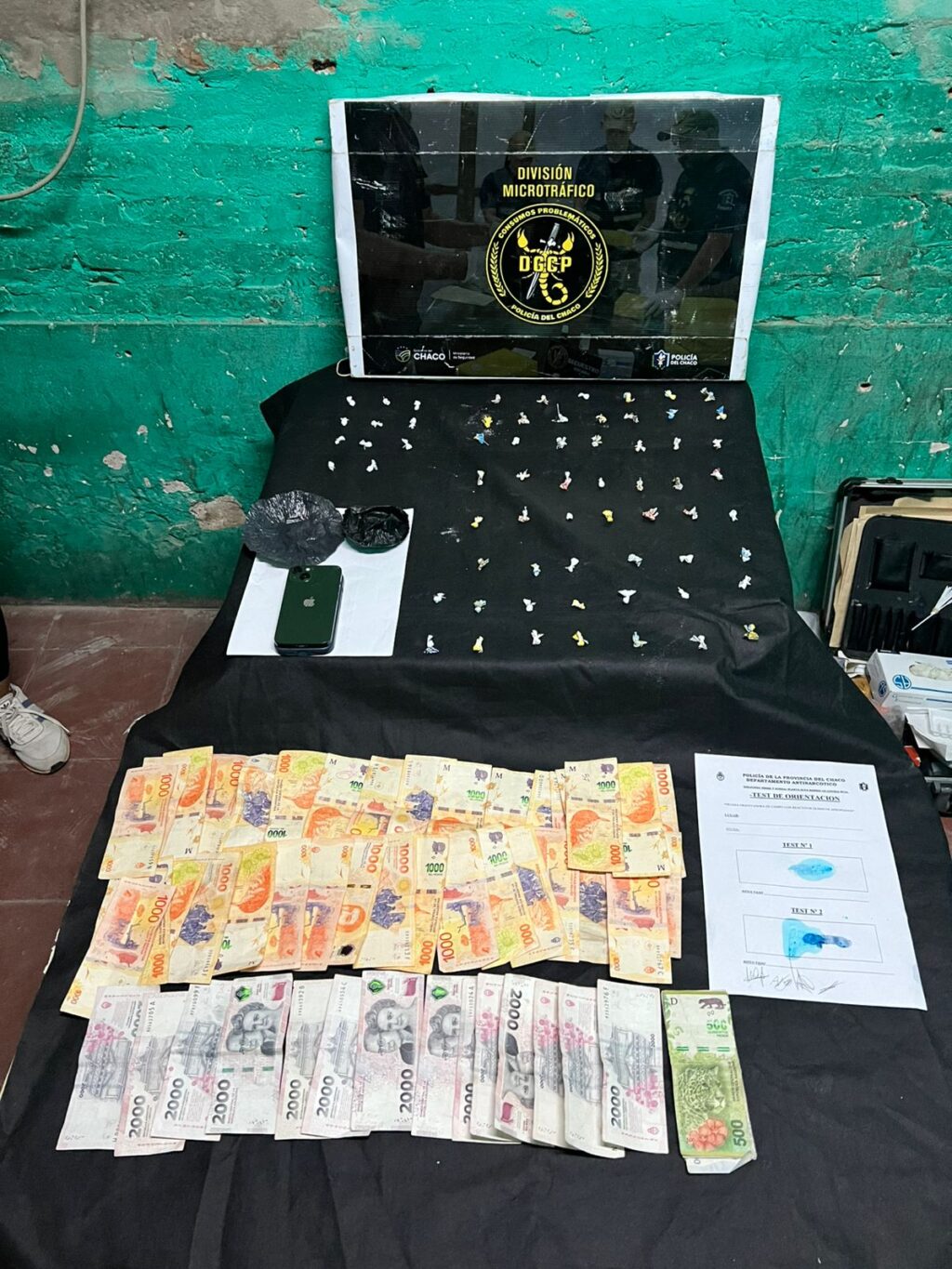 Durante el registro se secuestraron 65 envoltorios con cocaína con un peso total de 18,2 gramos, 65.200 pesos en efectivo y un teléfono celular iPhone 13.