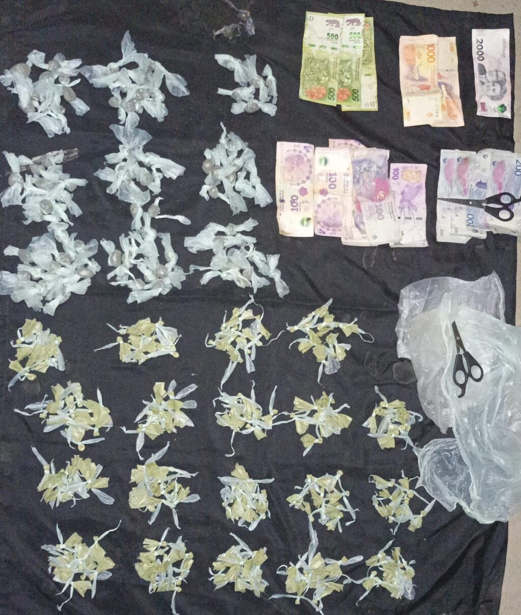 Después de identificarlo, los agentes le solicitaron que exhiba sus pertenecías, descubriendo que llevaba consigo una bolsa de polietileno transparente, dos tijeras, 188 bolsitas de color blanco y 87 bolsitas de color blanco con negro, además de la suma total de $7,100 pesos.