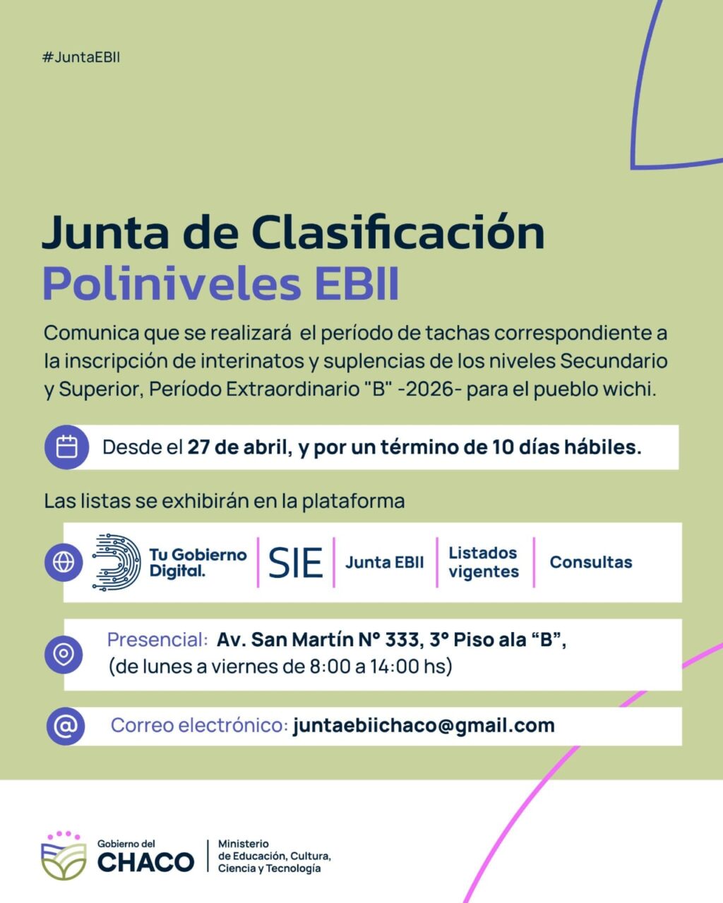 Ante cualquier duda o reclamo, los interesados podrán comunicarse vía correo electrónico a juntaebiichaco@gmail.com o acercarse de manera presencial a la sede ubicada en Av. San Martín Nº 333, tercer piso, ala “B”, en el horario de 8 a 16, de lunes a viernes.