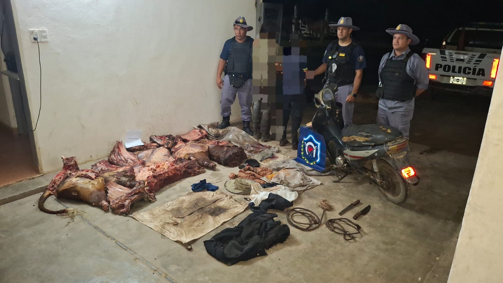 Se consultó con la fiscalía especial en delitos rurales y se dispuso que se instruyan actuaciones por Supuesto Abigeato, se secuestró el producto cárnico, una motocicleta, dos cuchillos, y prendas de vestir.