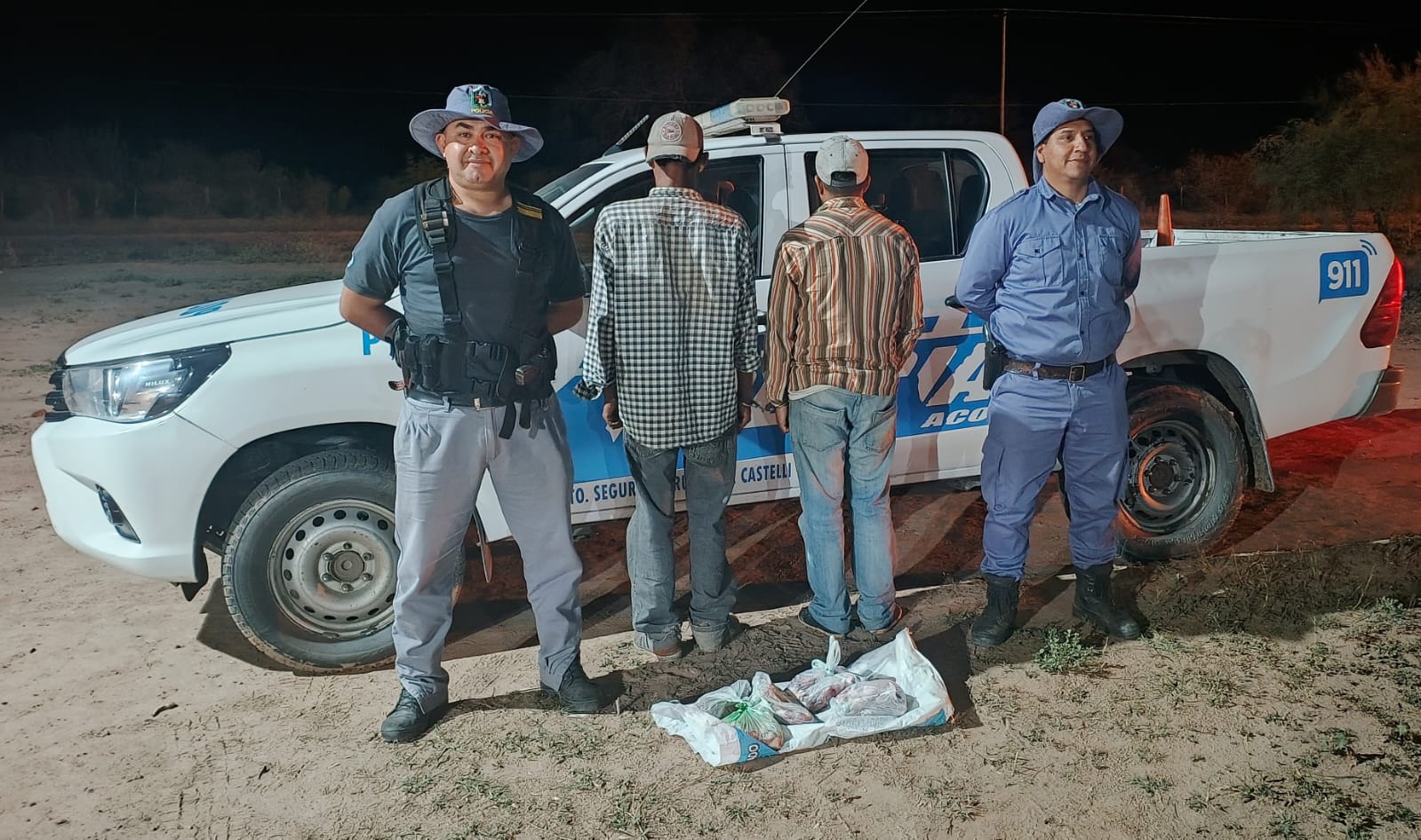 A 2 mil metros de la estancia hacia el cardinal norte, en un camino vecinal lograron la demora de dos hombres, que tenían en su poder 12 kilos de carne caprina recientemente faenada. Se procedió al secuestro y al traslado de los demorados de 24 y 55 años a la dependencia policial.