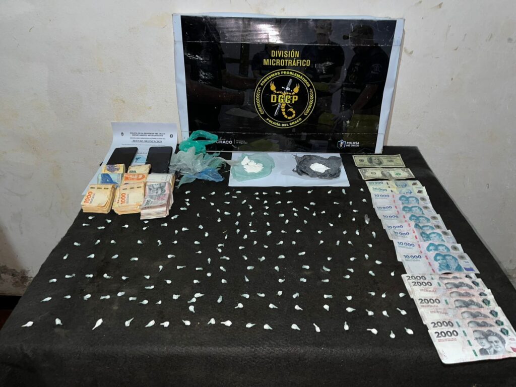 Durante la inspección incautaron 185 envoltorios de cocaína, además de dos “bochones” adicionales, que en total sumaron 69,5 gramos. También secuestraron $229.000 en efectivo, 101 dólares, bolsas utilizadas para el fraccionamiento y dos celulares.