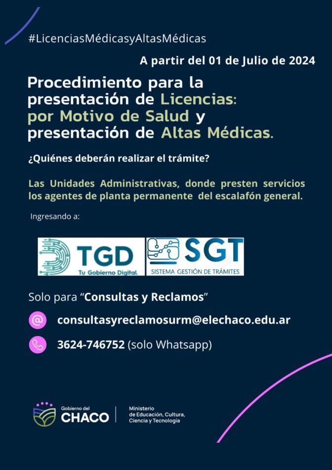 El Ministerio de Educación de la Provincia informa que, en virtud de las resoluciones N° 1762/2024 y 1770/2024, desde este lunes 1 de julio, estarán vigentes nuevos procedimientos para que el personal docente y no docente realice solicitudes de licencia y alta médica por motivos de salud. Dichas solicitudes se tramitarán a través de la plataforma Tu Gobierno Digital, con la única diferencia que el personal docente deberá realizarla mediante el Sistema Integral de Educación (SIE), mientras que para el personal no docente habrá dos modalidades, dependiendo de su lugar de servicio: los agentes de planta permanente del escalafón general, adscriptos a establecimientos educativos y personal de servicios que presten funciones en los establecimientos educativos dependientes de la cartera educativa realizarán la solicitud desde Trámites Online; por otra parte, para los agentes de planta permanente del escalafón general que presten servicios en las unidades administrativas dependientes de dicha cartera será a través del Sistema General de Trámites (SGT).