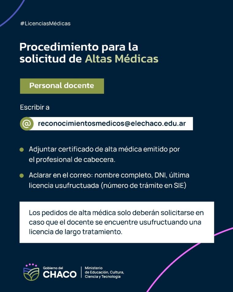 En cuanto al personal no docente, el paso a paso para iniciar solicitudes de licencias y altas médicas se encuentra detallado en el video tutorial disponible en el sitio dirdocumentacion.educacion.chaco.gob.ar/2024/06/27/solicitud-licencia/.