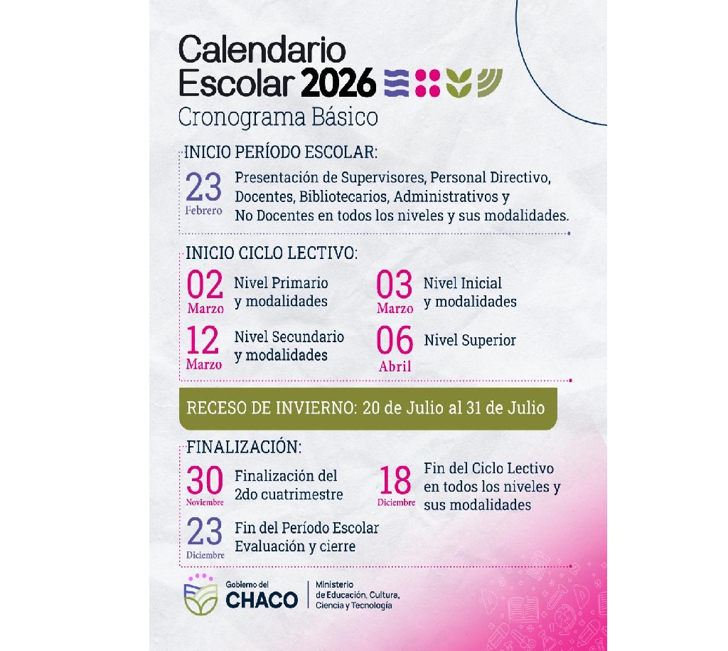 EDUCACIÓN ESTABLECIÓ EL CALENDARIO ESCOLAR BÁSICO 2026: EL 2 DE MARZO SE INICIARÁ EL CICLO LECTIVO EN EL CHACO