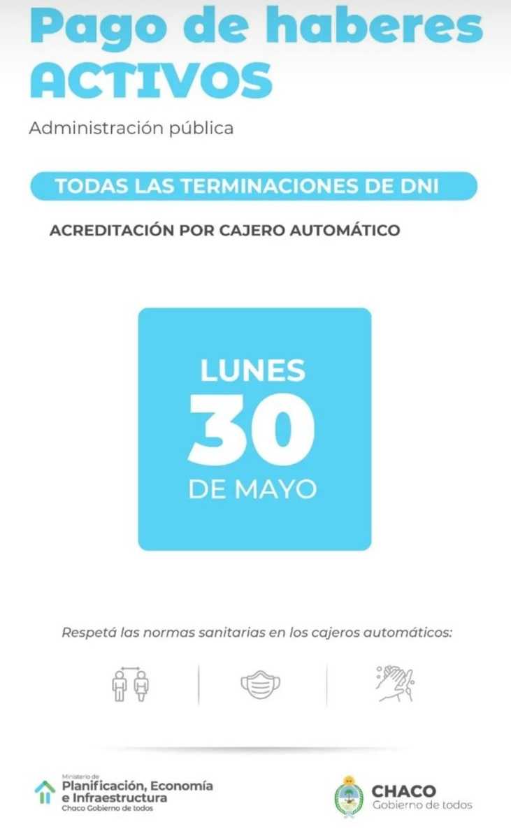 Ese mismo día, estarán acreditados los salarios de los trabajadores activos, para todas las terminaciones de DNI; que podrán pasar por ventanilla a partir del martes 31 de mayo.