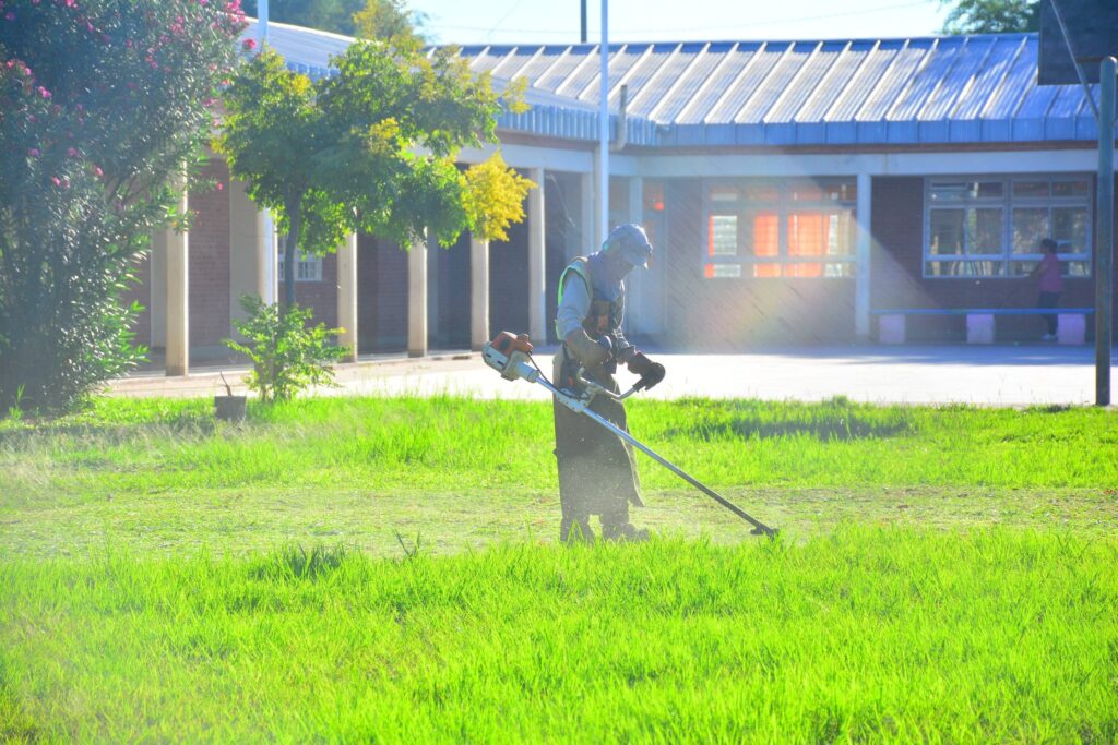 Las cuadrillas de operarios realizaron tareas de desmalezado en patios, espacios verdes y en todo el perímetro de la institución, incluyendo la limpieza y corte de pasto en las veredas, con el objetivo de mantener el establecimiento en condiciones adecuadas para la comunidad educativa.